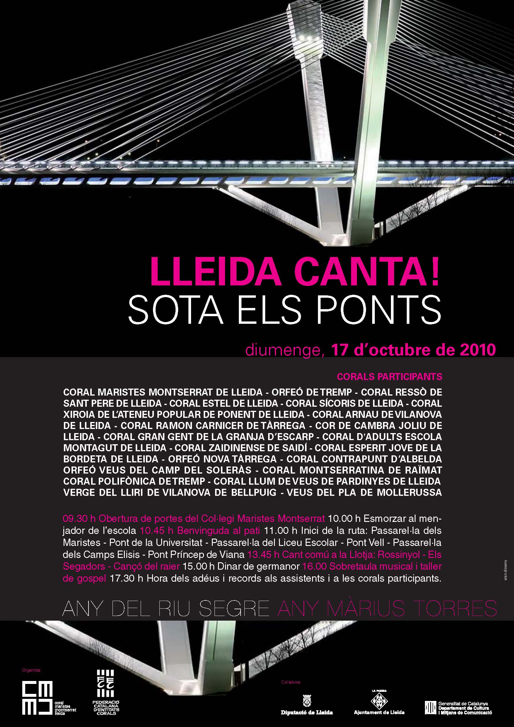És així com el segon Lleida Canta va aplegar 21 entitats corals de tota la demarcació. I el lema del 2010 fou “Lleida Canta sota els ponts”. Més de cinc-cents cantaires van recórrer els ponts i passarel·les de Lleida resseguint les seves sonoritats. Aquell diumenge, juntament amb els acompanyants, ens vam aplegar més d’un miler de persones.