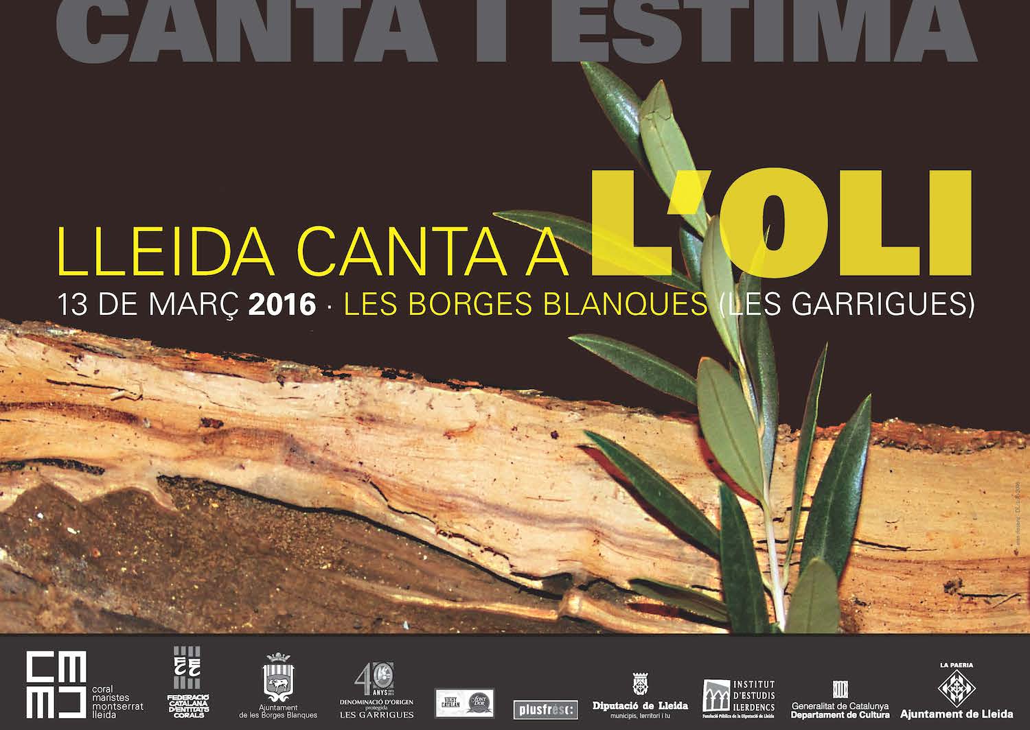 En aquella ocasió vam maridar música coral i el món de l’oli, a partir de la descoberta de paisatges relacionats amb aquest producte de primera qualitat tan nostre. Vam canviar la data, de la tardor a la primavera, establint el diumenge abans de Rams com el dia del Lleida Canta. El programa fou variat: des de trepitjar un camp d’oliveres, fins a degustar-ne el seu fruit daurat, passant per resseguir la història d’aquest conreu de secà. Tot emmarcat a la capital de les Garrigues i acompanyat per les melodies d’una seixantena de peces que van sonar al llarg de la jornada entre places, monuments i conreus. Va cloure la jornada el Cor Eurídice, de les Garrigues, i un taller de body percussion creat per l’ocasió. Per fer possible el Lleida Canta a l’Oli sumàrem esforços l’Ajuntament de les Borges, la DO les Garrigues i la Coral Maristes Montserrat. A més a més fou impressionant la complicitat i col·laboració del teixit associatiu de les Borges Blanques, que va permetre una festa ben participativa, culturalment rica i inclusiva.