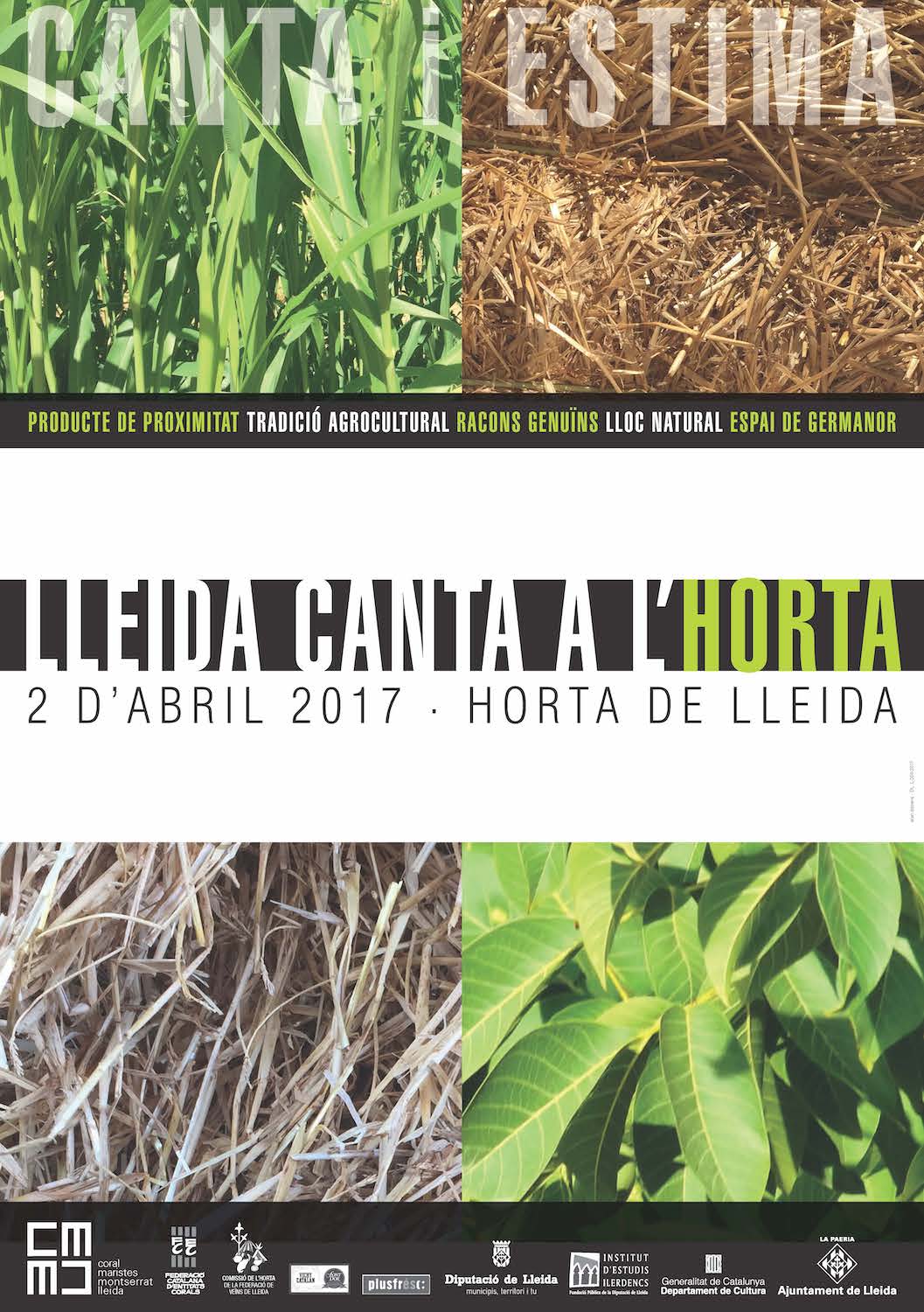 El 2017 vam celebrar la trobada a la ciutat de Lleida, en un indret que li dóna encants, com diu el poeta. Vam cantar a l’Horta, redescobrint aquest ric patrimoni verd que envolta la ciutat i li dóna una idiosincràsia característica. Lleida Canta a l’Horta ens va fer recórrer diferents partides i els concerts es van celebrar entre camps de conreu, granges, torres, sèquies i el riu Segre. La implicació dels veïns de les diferents partides acollint els cantaires fou la clau per sentir-nos acollits, com a casa. El dinar va tenir lloc al Mercat Central de Fruites i Verdures. Una cassola de tros immensa, acompanyats per diferents productors de fruita i verdura que van instal·lar un mercat de proximitat. La cloenda: ball animat a càrrec dels lleidatans Polcasol3. Dades: 31 corals, destacant l’augment d’entitats allunyades de Ponent que venen del Vallès Occidental, Maresme, Barcelonès i Berguedà.