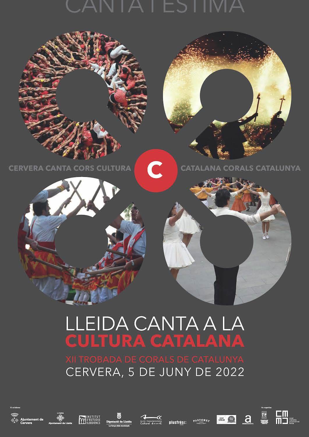 El repte de la 12a edició fou cantar a allò que ens fa poble, que ens uneix en tradició, història i estima a la nostra terra. Cantar a la cultura perquè després dels dos anys llargs de pandèmia, necessitàvem la vacuna de la cultura per guarir l’ànima personal i col·lectiva. Val a dir que aquest projecte el teníem enllestit per celebrar-lo al maig del 2020. Per tant, vam recuperar la proposta amb molta il·lusió i enriquida amb les ganes de recuperar la festa i la trobada col·lectiva. Vam cantar a la cultura catalana i ho vam fer a Cervera, recordant aquell 2019 en què va ser capital de la Cultura de Catalunya. El ball de gitanes, els bastoners, els diables, els gegants, els campaners… es van barrejar entre partitures i cançons, amb els escenaris del ric patrimoni històric de la capital de la Segarra.